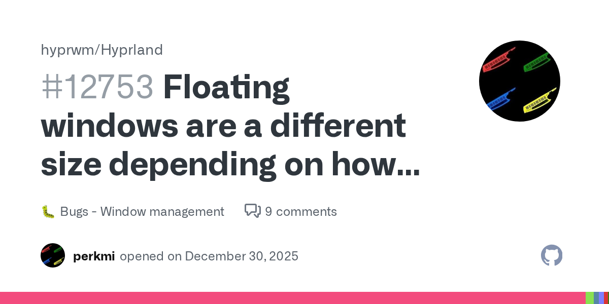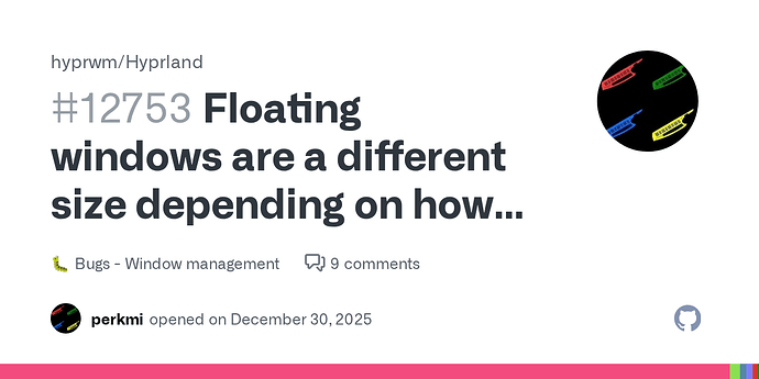 After the updated Hyprland to the newest version (0.53.0), the windowrules seemed broken. That was pretty easy to fix. The windows floats as expected but their default window size automatically gets resized to the monitor size (and another mobile aspect ratio, but more smaller in height like a tablet). Every app i set to auto float with the windowrule gets resized. Heres my windowrule config