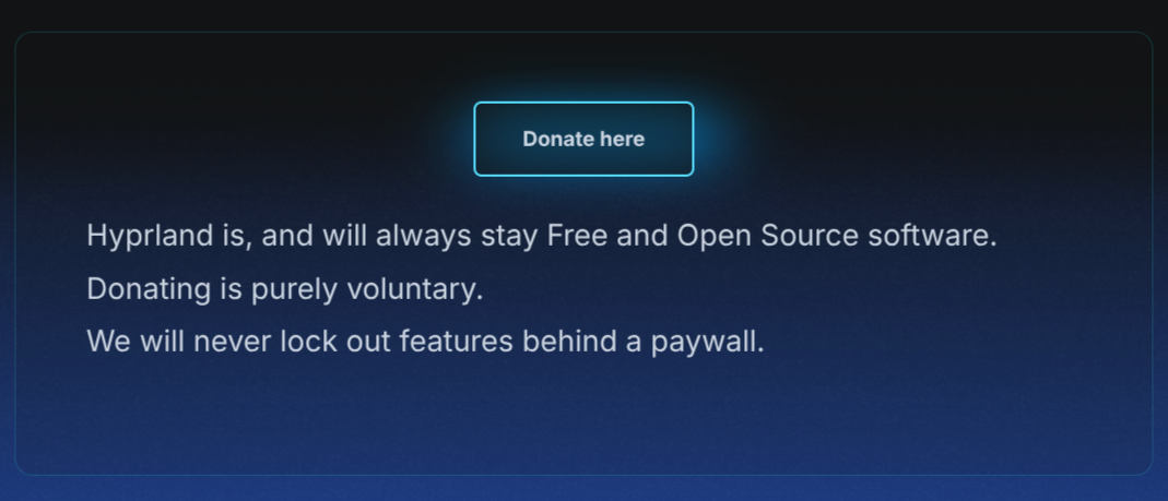 Hello everyone, I was wondering about the developers. Will Hyprland be paid in the future? Will it be separated into an open source support version when there is paid support? Even though this sounds like a ridiculous theory, I would still like to know the developers’ opinions on this matter.